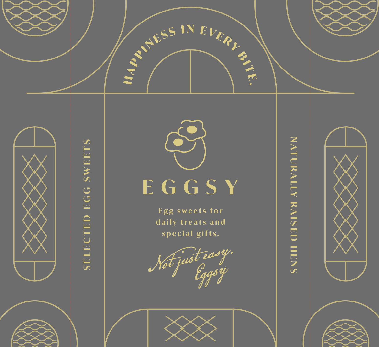 ブランドの象徴となる幾何学模様で、円弧は“やさしさ”や“つながり”を、直線は“誠実さ”や“信頼”を象徴し、その調和が「EGGSY」というブランドの世界観を形作っています。