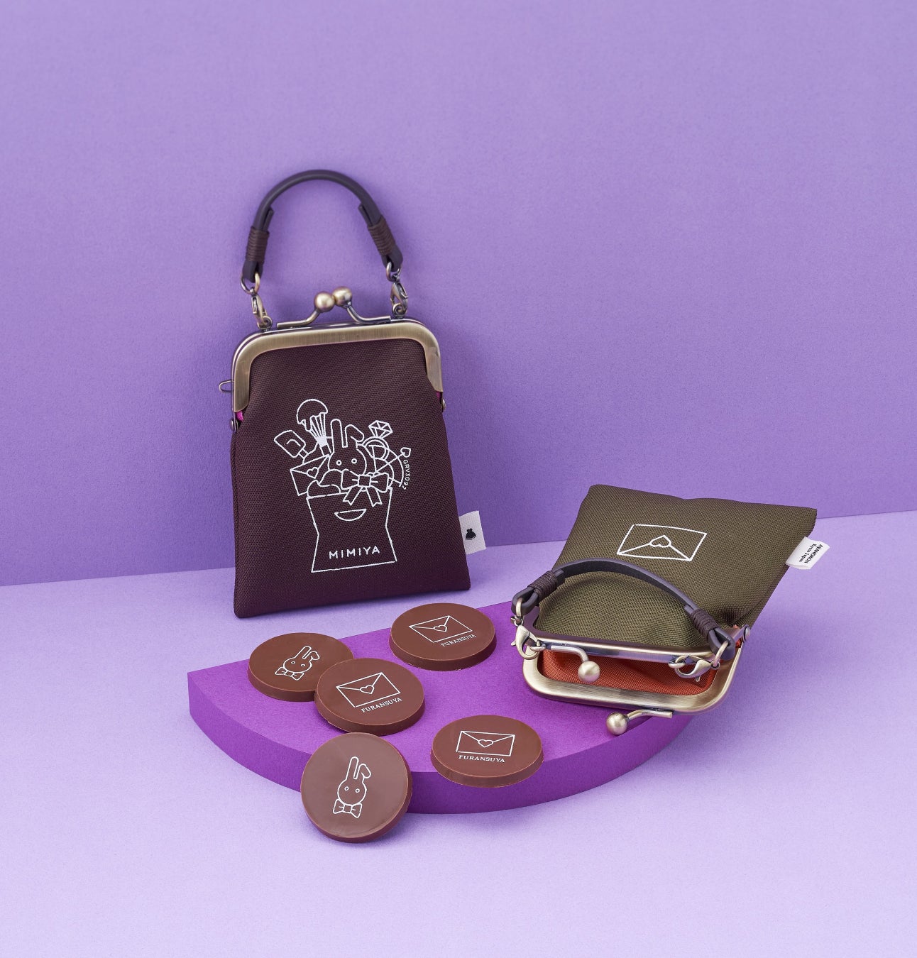京都でチョコレート作りをはじめて75年以上の〈フランス屋製菓〉。新定番の京みやげを提案する〈三三屋〉のデザインをプリントしたオリジナルショコラを、京都のがま口専門店〈AYANOKOJI〉のがま口ポーチにインしました。