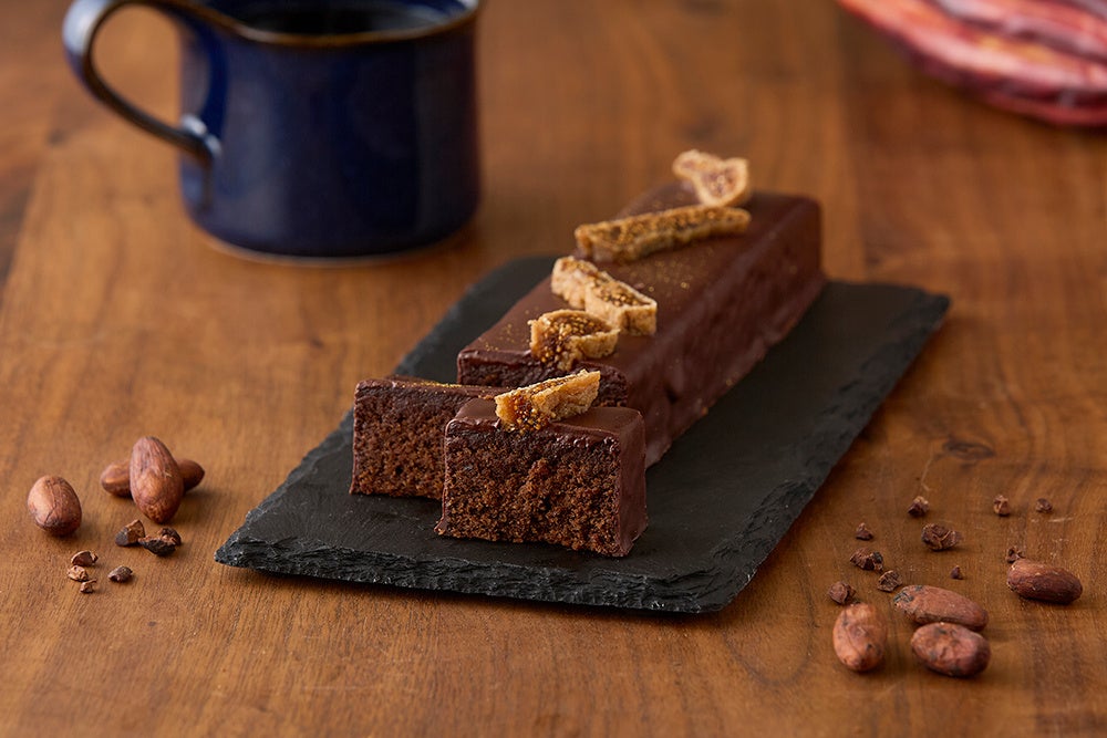 『インターナショナルチョコレートアワード2021-2022アジア大会』銀賞受賞のチョコレートを使用。小麦粉と白砂糖不使用のこだわり抜かれたチョコレート生地は、丹波赤ワインに漬け込んだイチジク入り。チョコレートでコーテイングし、ドライイチジクをトッピングしました。
