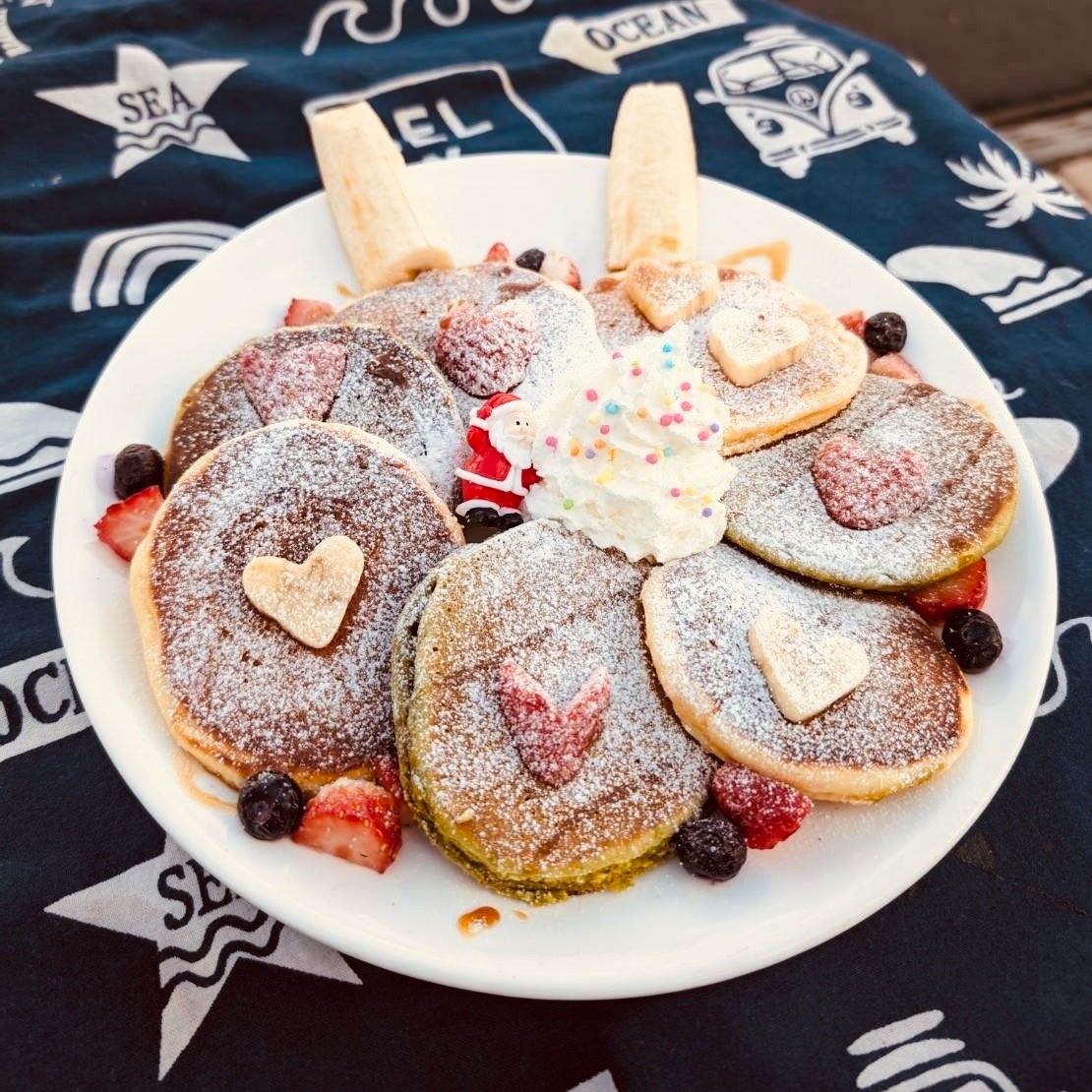 小さなパンケーキを敷き詰め、ハート型の季節のフルーツやホイップクリーム、パウダーシュガーで飾り付けた自家製パンケーキは、サンタさんからのプレゼントのような華やかさ。数人でシェアできるボリュームも魅力です。