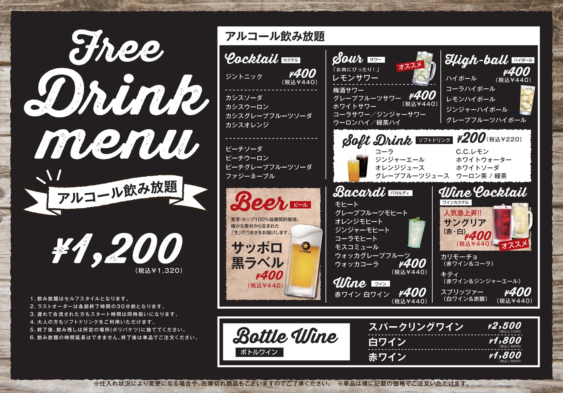 +1200円(税込1320円)でアルコール飲み放題(平日4時間!、土日祝3時間!)も追加可能。
