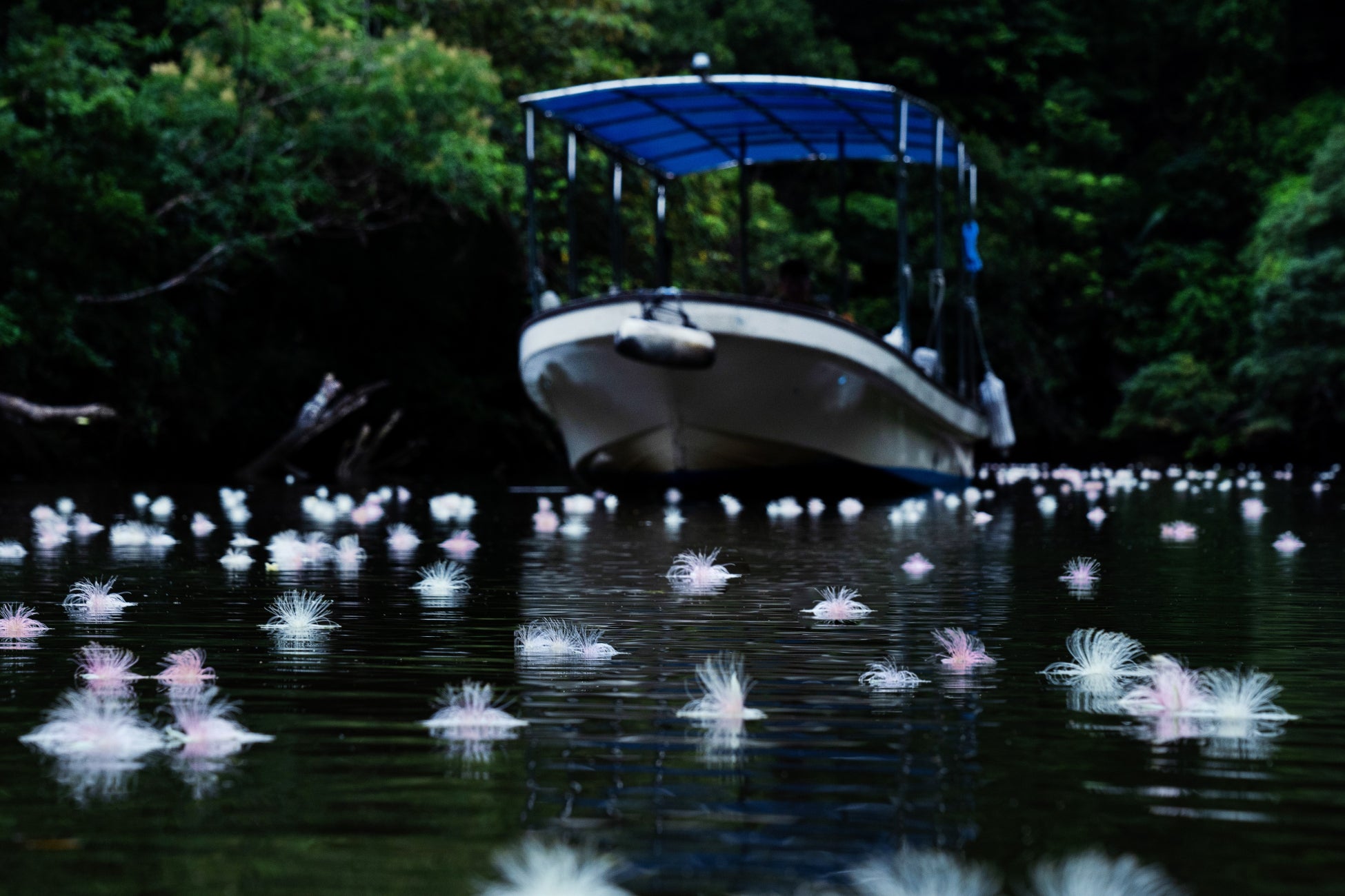 船上では、ガイドがサガリバナの生態について解説します。また、蕾の状況を見てその日のベストスポットに案内。どのように木に咲くのか、どのような場所を好んで生育するのか、サガリバナについて詳しく知ることで、一夜限りの花が織りなす情景を、より深く楽しむことができます。