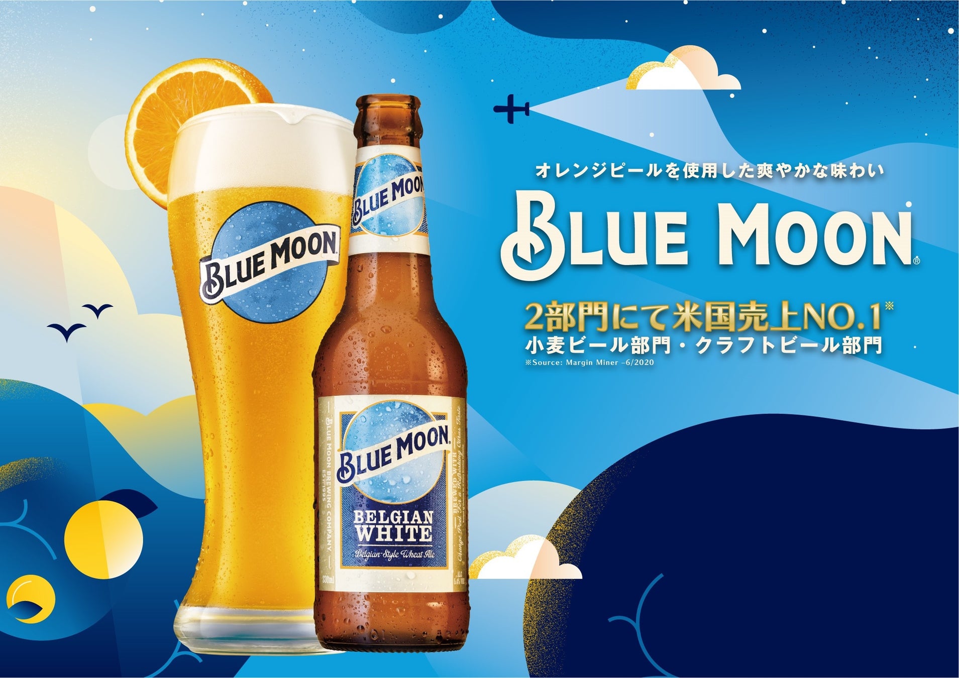 BLUE MOONは、1995年にアメリカで生まれた全世界25か国以上で楽しまれている米国No.1クラフトビール。醸造家であり創業者のキース・ヴィラ氏が、コロラド州デンバーにある野球場にある醸造所でベルギーの伝統的な小麦ビールの製法にヒントを得て、オレンジピールやコリアンダーの風味を加えた香り豊かな独創的なビールを醸造した。試合を見に来るファンの圧倒的な支持を集めたのが始まりで、この味わいに感激したファンのひとりが思わず「こんなに素晴らしい味は奇跡!(ONCE IN A BLUE MOON ! )」と声を上げたことがきっかけで、BLUE MOONが誕生。