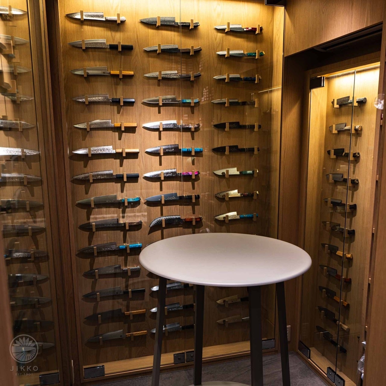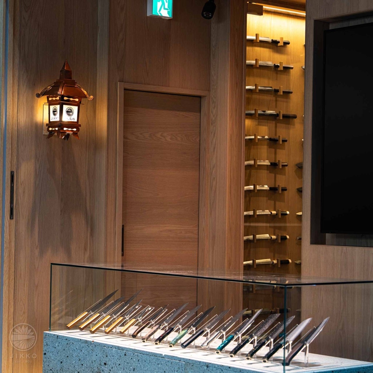 広さの関係上、陳列できる包丁の数量に限りがあるので、實光刃物のブランドを中心に揃えた「JIKKO Professional」店になります。實光刃物オリジナルブランドの至光シリーズ、銀座シリーズ、祇園シリーズなどプロの方に満足して頂けるラインナップを陳列しています。