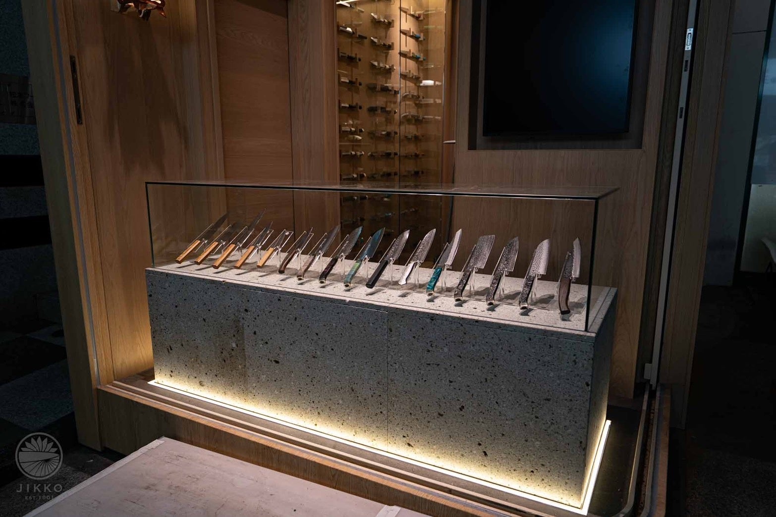 入口のショーケースは、包丁を1本ずつ宙に浮かせたようなデザインにし、歩行者が通りから見やすくしています。