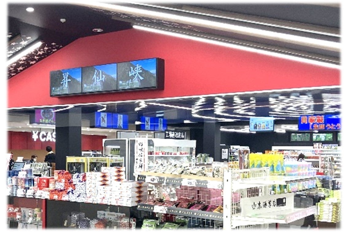 双葉SA(上り)では、地元甲斐市をはじめとした地域の観光情報などを店内のサイネージを活用して紹介し、もっと山梨を知っていただけるよう情報発信を行ってまいります。