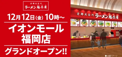 0 ニュース速報 / 九州エリア / 福岡エリア / ラーメン / 最新ニュース(全国編) / 全国グルメ / 新店舗オープン情報! 2025年12月4日 by ensen-gourmet · Published 2025年12月4日 【オープン記念価格!】京都北白川 ラーメン魁力屋「イオンモール福岡店」(福岡県糟屋郡)が2025年12月12日(金)にグランドオープン! 「イオンモール福岡店」のオープンを記念し、京都背脂醤油ラーメンを特別...