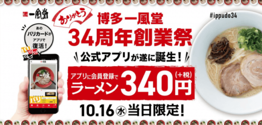 一風堂、10/16感謝をこめて34周年創業祭 第2弾 公式アプリへの...